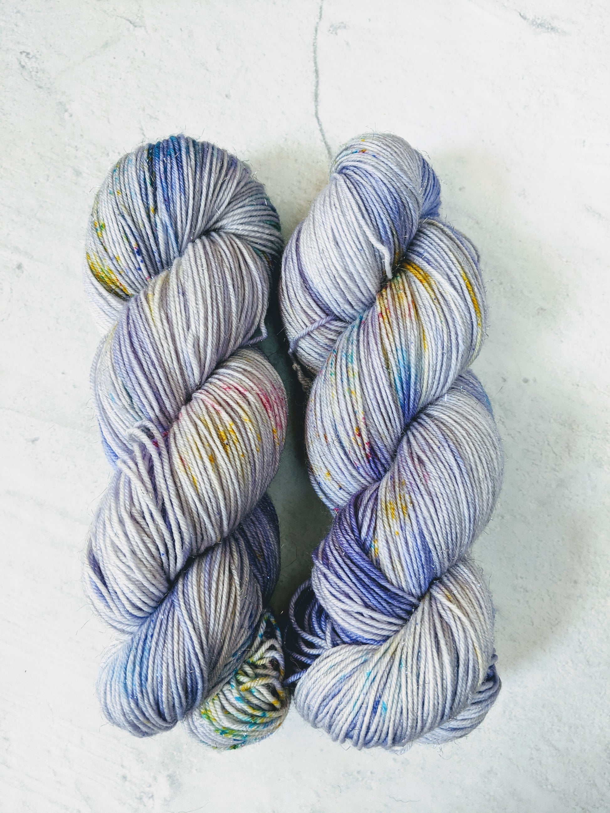 Silver DK: 75/15/10 Superwash Merino, Nylon, Silver Stellina. 246 yards/225 meters.